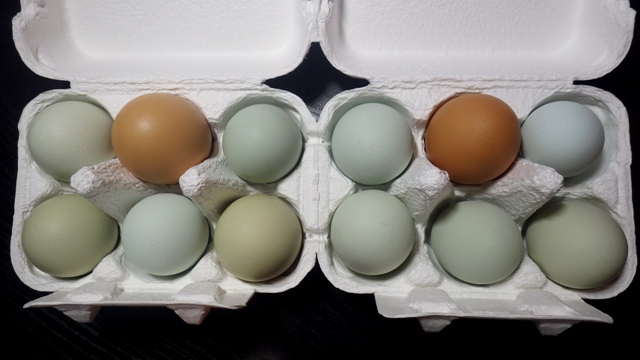 | 青い卵を産むアローカナ種の種卵を10個プラスおまけで3個以上お付けしてお送りします。当方、現在、アローカナ種、名古屋種、比内鶏等、10種類程の品種を採卵用に今年度分の繁殖中です。人工授精後の余剰な種卵がしばらくの間は得られますので、必要な方はこの機会にどうぞ。孵化用に用いる事を前提に洗卵は行いません。現在のところ受精率は70〜80%、対受精孵化率は90%程度です。2回/週の頻度で複数羽の雄の混合精子を人工授精しております。発送はヤマト運輸を予定しております。当方での貯卵温度は15℃程度ですが、輸送中の高温が気になる方はクール便(冷蔵)のご指定が安全かと思います。*写真は当ファームの商品ですが今回出品の種卵の色は茶色(2個)以外の青色系卵となります。参考までにご覧下さい。種鶏群の産卵率はピーク時で80%台後半、500日齢頃の総産卵率で70%程度です。5%産卵は160日(23週)頃となります。 |